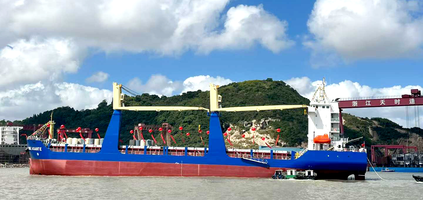 2025年10月10日,一个寓意“十全十美”的吉日。在美丽的台州海岸,阳光洒金,碧波欢腾,128米无限航区甲板船——“中荃10”和484TEU多用途集装箱船“AWIE ASANTE”轮,两艘新船在万众瞩目中相继吉水,在秋日暖阳映照下,划出两道璀璨的航迹。